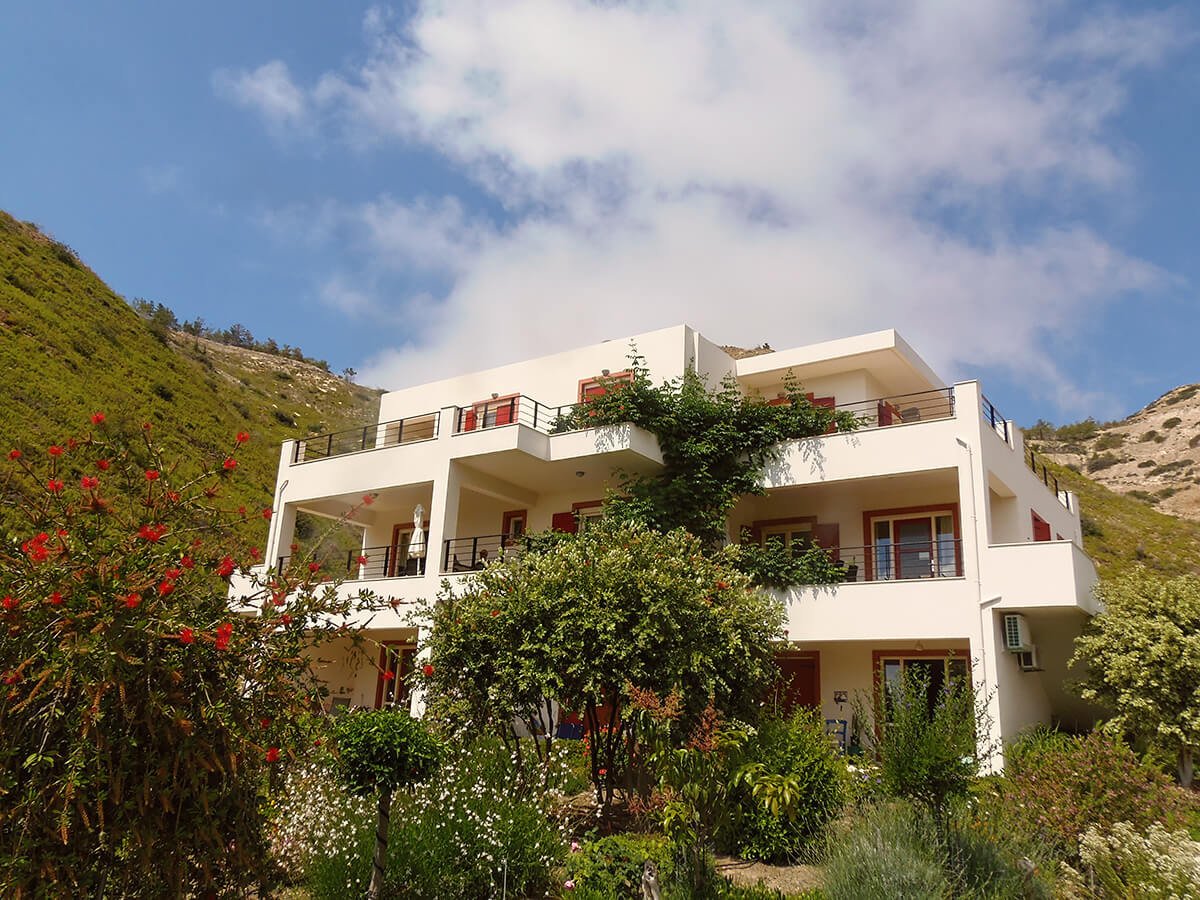 At the edge of the inviting and serene village of Mirtos, located in south-east Crete, approximately 450 meters from the village’s shops and tavernas and its boulevard and beach, you’ll find Villa Dianthe. The villa holds five beautiful, highly spacious apartments (four with two bedrooms and one with three bedrooms) and is situated in an astonishingly calm environment. From its large balconies or terraces you’ll have splendid views of the villa’s green surroundings and the sea. The road to the village and the beach hardly slopes, making it accessible to anyone.